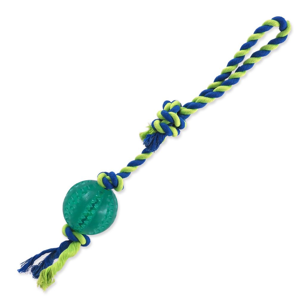 Provazová hračka s míčkem se speciálními drážkami, které brání tvorbě zubního kamene a masírují dásně.